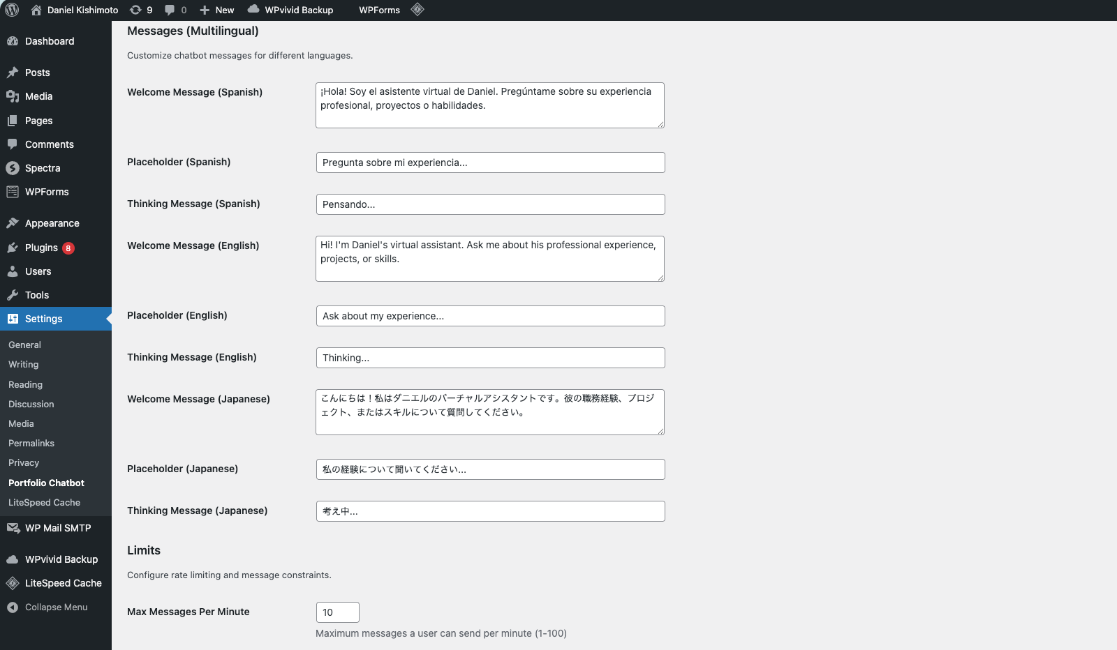 The chatbot is connected to my professional data — work history, skills, projects, tools. Built with [tech stack details]. It answers based on my actual experience, not generic responses.